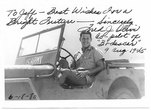 OLIVI, Fred (1921-2004). Co-pilot of Bockscar. Dropped the -Bomb on Nagasaki, 9 Aug, 1945. The was the last atomic bomb attack. Photograph of Olivi in a Jeep, measures appx. 5”x7”, inscribed and signed adding “...Co-pilot of Bockscar 9 Aug. 1945”. In fine condition.......................................$47.50![]() |