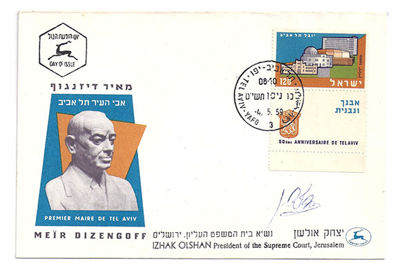 OLSHAN, Isaac (1895-1983). Jurist, Original Supreme Court Justice when the State of Israel was created. Israeli First Day cover commemorating the 50th Anniversary of Tel-Aviv. Portrait of Meir Dizengoff, founder of the city of Tel-Aviv. Signed by Olshan in Hebrew. Not a common autograph.................$100.00 ![]() |