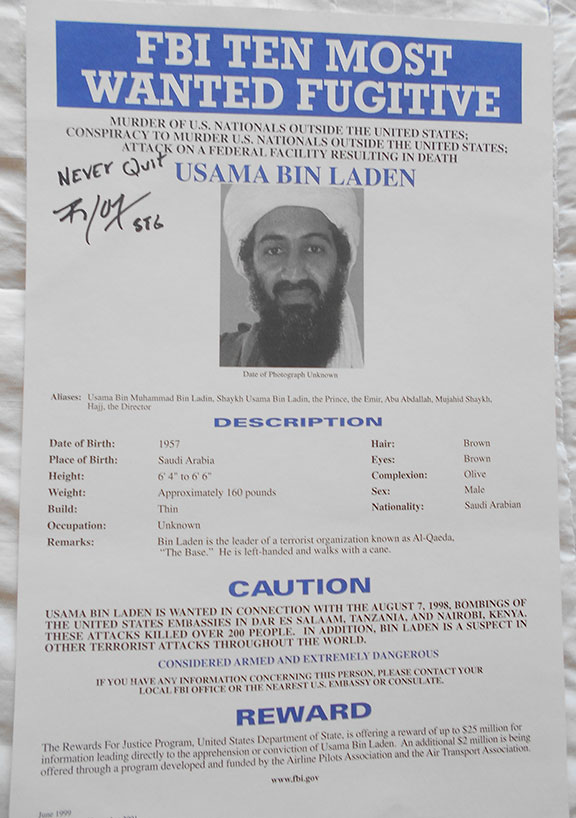 O’NEILL, Robert J.   (1976-    )  Member of Seal Team 6. Credited with shooting Usama Bin Laden with three bullets which killed him.  Bin Laden (1957-2011) was the founder of al QAEDA a major terrorist organization.  Original FBI Wanted Poster (November 2001) for Usama Bin Laden. The reward is for up to $25 million plus $2 million  funded by Airline Pilots Association.  Signed “Never Quit Robert O’Neill ST6.”  In very fine condition and a very rare original FBI signed wanted poster