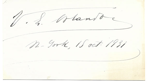 ORLANDO. V.E. (1860-1952) Italian Prime Minister (1917-1919). Represented Italy Paris Peace Conference, known as “Premier of Victory.” He changed Italy’s form of government into a Republic. In 1925 he stated he was proud of being mafioso. During 1948 he was elected by Parliament as a candidate for President. Choice signature on a large card: “V.E. Orlando dated N.York, 18 oct. 1931.”.................$95.00![]() |