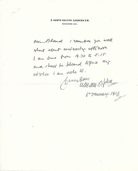 ORPEN, Sir William (1878-1931) Irish artist working mostly in London. A successful painter of portraits for the well-to-do in the Edwardian society. His works of the war were stunning and horrific and still have the power to shock onlookers today. Autograph letter signed on his address imprinted stationery. 6th January 1928 he writes: “Dear Bland, I remember you well. What about Wednesday afternoon. I am free from 4.30 to 5.15 and shall be pleased to give any advice I am able to. Yours ever, William Orpen.” In fine condition..................$375.00