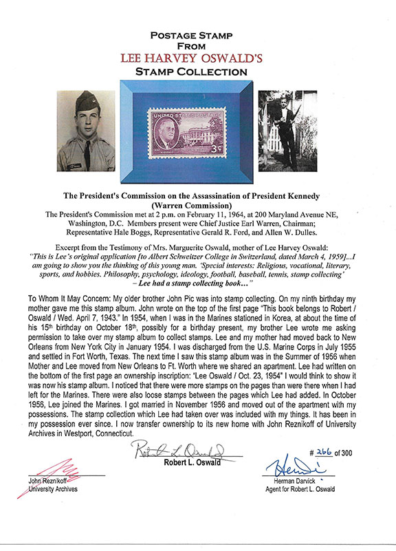 OSWALD, Robert (1934- ) Older brother of Lee Harvey Oswald and a former Marine. He agrees with the Warren Commission, they got it right, Lee Harvey Oswald killed President John F. Kennedy. The three Oswald brothers were stamp collectors with The oldest brother passing the stamp album to Robert and Robert eventually passing the album to Lee. Lee continued building the collection and wrote an ownership inscription in the book: “Lee Oswald / Oct. 23, 1954.” The collection was purchased by a seller of autographs and a limited edition of only 300 numbered copies was created. Each copy contains a stamp from Lee Harvey Oswald’s collection. Offered is copy #266 of 300 hand signed by Herman Darvick, naming himself as the Agent for Robert Oswald (Darvick is also well known in the autograph hobby as admitting he is a forger of autographs) and signed by the seller of autographs who purchased the collection and also hand signed by Robert Oswald. A nice presentation describing the back ground of the stamp album. The U.S. 3 cent stamp affixed to this presentation ironically is one of a President of the United States, Franklin D. Roosevelt with a portrait of The White House. Overall item measures 8.5”x11”. In mint condition................................SOLD