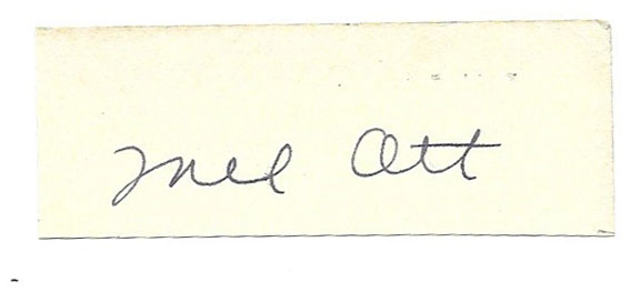 OTT, Mel (1909-1958). Elected into the Baseball Hall of Fame (1951). He led or shared the National League home run title six times while compiling a career total of 511. He was a life time .304 hitter and smacked 2,876 hits over 22 seasons with the New York Giants. A fabulous full signature in ink with ample margins for framing....................$775.00![]() |
