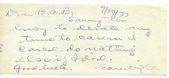 OVINGTON, Earl (1879-1936). Exhibition flyer, First U.S. Air Mail pilot. Carried 75 pounds of letters and postcards on September 23, 1911 from Garden City, N.Y. to Mineola, N.Y. 3 miles away. Former assistant to Thomas Edison. Died at the early age of 56. Scarce autograph letter signed, one page, July 14/33. On a slip of paper 2.5”x6” he writes: “Dear B.A.B., Sorry too busy to devote any time to covers. I could do nothing else if I did. Good Luck. Earl Ovington.” In fine condition.........$150.00