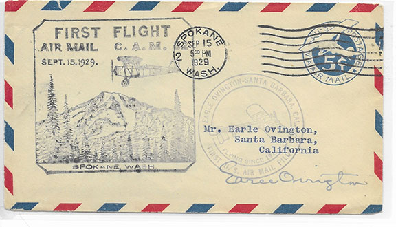 OVINGTON, Earl (1879-1936). Exhibition flyer, First U.S. Air Mail pilot. Carried 75 pounds of letters and postcards on September 23, 1911 from Garden City, N.Y. to Mineola, N.Y. 3 miles away. Former assistant to Thomas Edison. Died at the early age of 56. Interesting Air Mail cover, commemorating Ovington’s First Air Mail Flight from Spokane, Washington. Cachet of Ovington’s plane flying over the mountain in Spokane, Washington in 1929, Printed U.S. Air Mail postage stamp cancelled Spokane, Washington, SEP 15, 1929. Hand signed by Earl Ovington. Scarce as Ovington has typed in his own name and address and has flown this cover. In fine condition........$175.00