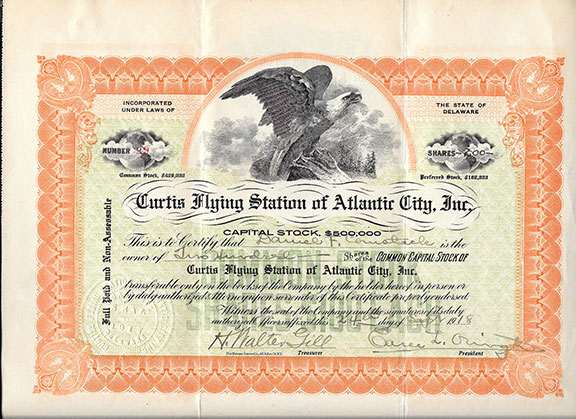 OVINGTON, Earle (1879-1936). Aviator, inventor, lab assistant to Thomas Edison. Ovington attended Louis Bleriot’s aviation school in France. He may be best known as the Pilot to fly the first Official Air Mail. In September 1911, he flew the mail from Garden City, New York to Mineola, New York. Beautifully engraved Stock Certificate by The Brown-Green Co. 48 John St. New York. Curtis Flying Station of Atlantic City, Inc. Ornate border with a vignette of an Eagle perched on a rock. 24 September 1918, certifys that Daniel Comstock is the owner of 200 shares. Hand signed by the Treasurer, H. Walter Gill and the company President, Earle L. Ovington. In fine condition............$695.00