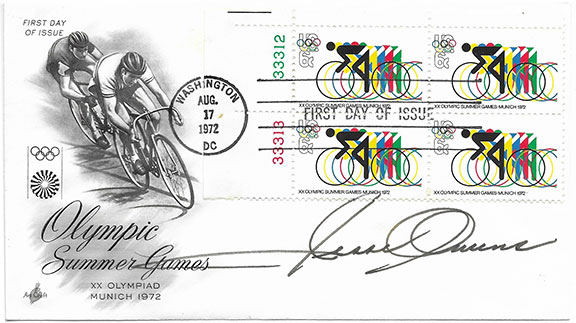 OWENS, Jesse (1913-1980). African-American Olympic athlete who won four gold medals in the Nazi-hosted 1936 Olympic Games. He defied Hitler disproving Hitler’s theory that blacks were an inferior race. Owens received a standing ovation by 100,000 spectators. Hitler left the stadium. Choice First Day Cover commemorating the Olympic Summer Games. Cachet of two men racing on bicycles in the XX Olympiad Munich 1972 Olympics. Affixed are 4 U.S. 4 cent XX Olympic Summer Games Munich 1972 postage stamps cancelled Washington, DC, Aug 17, 1972. Very boldly hand signed by Jesse Owens. A magnificent signature 5” long. In mint condition. A very busy and attractive cover. Quite scarce in the format.....................$575.00