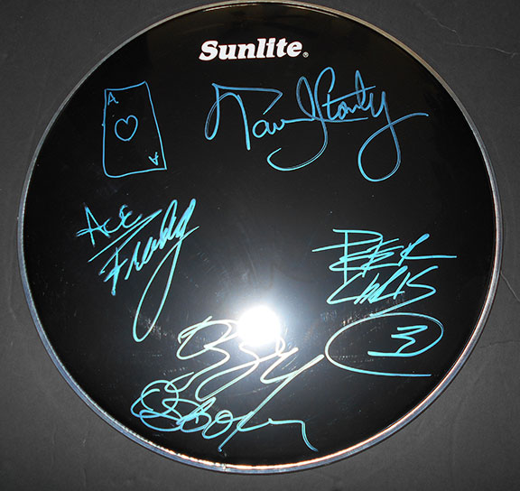 Three Kiss members and Ozzy Osbourne on a 13” Drum Head FREHLEY, Ace (1951- ) American musician, lead guitarist and founding member of the rock band Kiss. CRISS, Peter (1945- ) American drummer who co-founded the rock band Kiss. STANLEY, Paul (1952- ) American musician, co-lead vocalist and guitarist for Kiss. During the 1980’s he was the driving force for Kiss. Sunlite Drum Head, 13” boldly signed by all four. Stanley, Criss and Frehley were inducted into the Rock & Roll Hall of Fame in 2014. Osbourne was inducted as part of Black Sabbath in 2006. In very fine condition..............................SOLD ![]() |