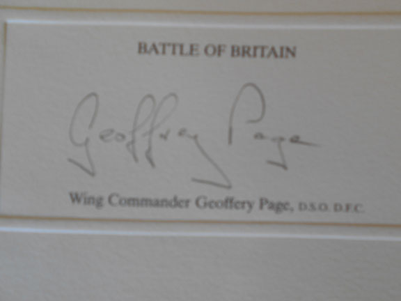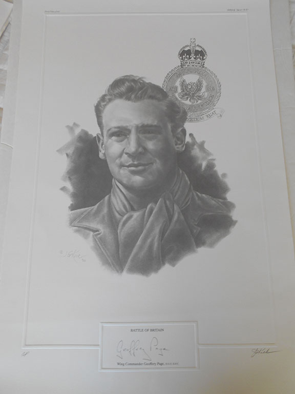 Alan Geoffrey Page, DSO, OBE, DFC & Bar (16 May 1920 - 3 August 2000), known as Geoffrey Page, was an officer in the Royal Air Force who served during the Second World War. He participated in the Battle of Britain and was shot down. He was badly burned when his aircraft was destroyed and was lucky to survive. He underwent many surgeries on his way to recovery, and was a founding member of the Guinea Pig Club. He eventually passed a medical exam and returned to active service, becoming one of England’s most successful fighter pilots. In very fine condition. This print is numbered “Artists Proof”................$125.00