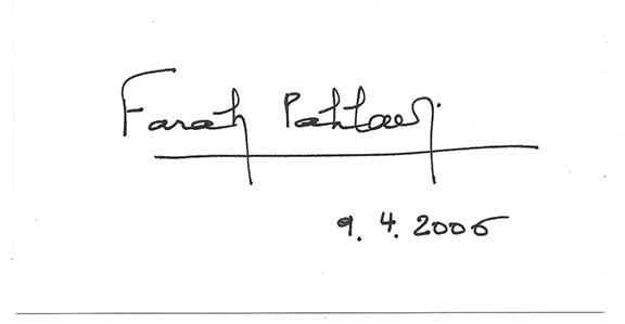 PAHLAVI, Farah  (1938-    ).Widow of Mohammad Reza Pahlavi. She is the former Empress of Iran. Mother of Crown Prince Reza and three princesses. She founded Iran’s first American-style university. She left her country in January 1979 under a death sentence. She has received honors from 25 different countries. Choice bold full signature dated 9.4.2006 on a white 3”x5” card. A very desirable signature