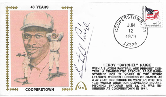 PAIGE, Satchel (1906-1982) American professional baseball player who played in the Negro Leagues and Major League Baseball. Inducted into the National Baseball Hall of Fame (1971). Gateway Cachet 1979 cover with a fine silk cachet of Paige, three portraits. Affixed is a 15 cent U.S. Flag postage stamp cancelled Cooperstown, N.Y. Jn 12, 1979. Signed by Satchel Paige with a choice signature. In mint condition.........$1200.00