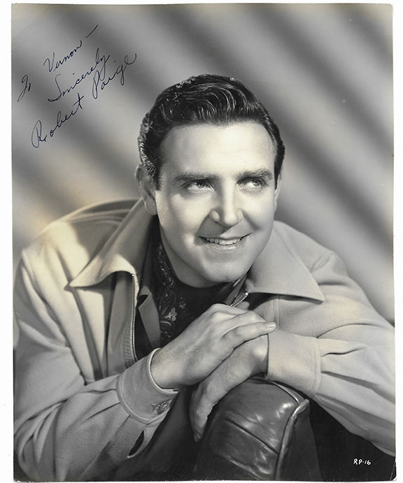 PAIGE, Robert (1911-1987). ACTOR AND tv Newscaster. Leading man who made 65 films. He is the only actor ever allowed to sing on film with Deanna Durbin (1944). He appeared with Lon Chaney, Jr in Son of Dracula (1943). He used a screen name of David Carlyle in his 7 early films. Vintage Universal Pictures borderless photograph, 7.5”x9” head and shoulders pose, smiling. Inscribed: To Vernon-Sincerely Robert Paige. Signed vintage photos of Paige are somewhat scarce. In fine condition......................$75.00