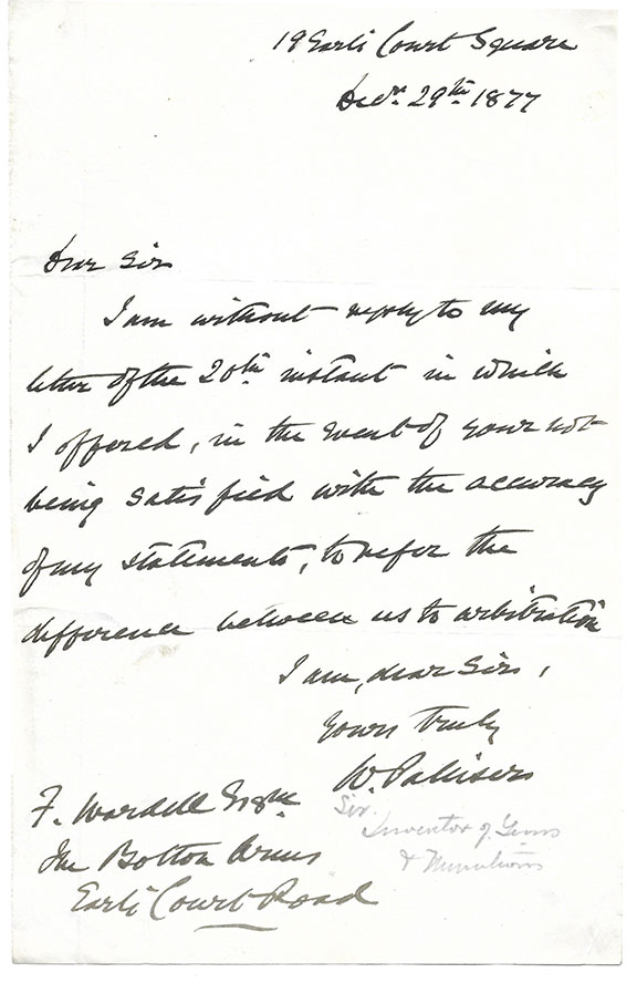 PALLISER, Major Sir William (1830-1882) Irish born politician and inventor. Member of Parliament for Taunton from 1880. His brother was Captain John Palliser, a geographer and explorer. Palliser patented 21 ordnance-related inventions, including the armor-piercing Palliser shot. He designed the “Palliser conversion” technique which was used successfully to convert many of Britain’s obsolescent but still serviceable smoothbore muzzle-loading guns into more modern rifled muzzle-loaders in the late 1860’s into the 1870’s. Autograph letter signed, a very nice one-page example, 19 Earls Court Square, 29 Dec. 1877. 8’x5” Palliser writes to F. Wardell, The Bolton Arms, Earls Court Road, about a legal dispute..................$110.00