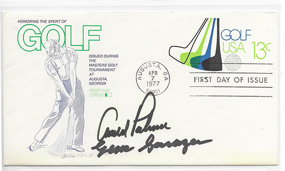 PALMER, Arnold (1929-2016). American pro golfer. Regarded one of the greatest players in sports history. First to win the Masters Tournament four times. SARAZEN, Gene (1902-1999). One of the world’s top golfers during the 20’s and 30’s. He invented the sand wedge. Nice FDC honoring the Sport of Golf. Cachet of a golfer taking a swing. Affixed to this cover is a U.S. 13-cent Golf postage stamp, cancelled First Day of Issue, Augusta, GA, APR 7, 1977. Very boldly hand signed by Palmer and Sarazen. Cover in very fine condition....$145.00