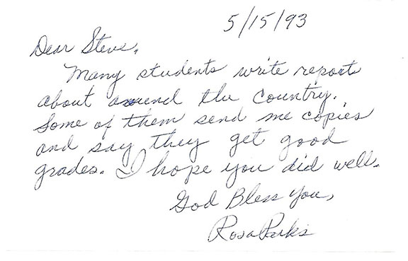 PARKS, Rosa (1913-2005). African-American Civil Rights Advocate. The U.S. Congress calls her “The First Lady of Civil Rights.” On December1, 1955 she refused to give up her seat on a bus to a white passenger. Autograph letter signed, one page, May 15, 1993, she writes: “Dear Steve, Many students write reports about around the country. Some of them send me copies and say they get good grades. I hope you did well. God Bless You, Rosa Parks.” Autograph letters signed by Rosa Parks are considered quite scarce to rare. In excellent condition...........................SOLD