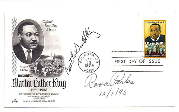 First Day Cover, commemorating the First day of issue of the Martin Luther King, Jr. U.S. 15 cent postage stamp. Choice engraved portrait of head and shoulders pose of King on the left and another of King giving his famous speech in Washington, D.C. Signed by Coretta Scott King and signed and date “12/7/90” by Rosa Parks. A fabulous and scarce combination of signatures. Mint condition..................................SOLD