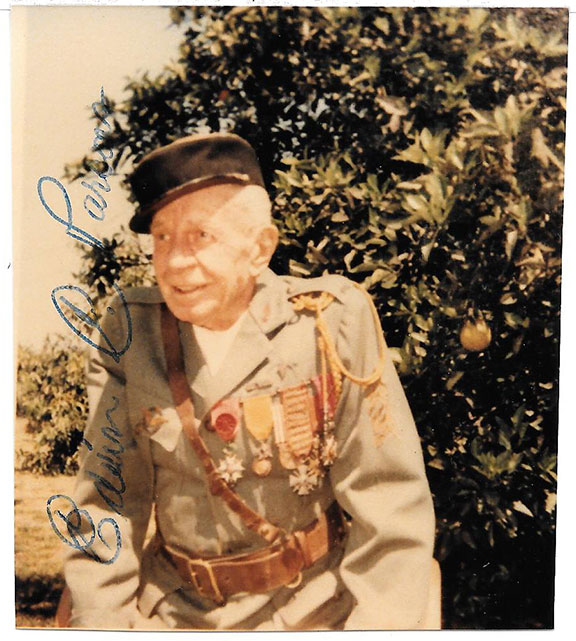 PARSONS, Edwin C. (1892-1968). American fighter pilot in WW1. Served only with the French Air Services. Ace, credited with 8 victories. Awarded the Medaille Militaire and the Croix-de-Guerre. Color photograph, partly trimmed of the Ace in old age dressed in uniform, half length pose, smiling and wearing his medals. Signed in full with good contrast. An uncommon signed photograph....SOLD![]() |
