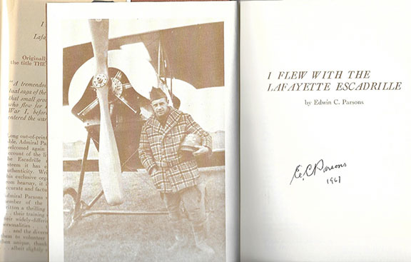 Parsons book: “I Flew With the Lafayette Escadrille” E.C. Seale & Co. Indianapolis, Indiana 1963. Three hundred thirty-five pages, illustrated. Signed and dated “1967” by E.C. Parsons. Bookplate on front free endpaper otherwise in near fine condition with the very scarce dust jacket...........................$110.00
