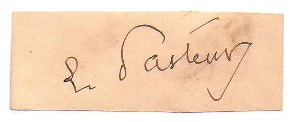 PASTEUR, Louis (1822-1895). French chemist. Investigated diseases of wine and beer. Recognized as the most important figure in medical history for proving that germs cause infection and disease. Developed pasteurization of milk, beer and wine to kill micro organisms. Nice dark signature cut from a letter. Not common in clipped signatures................................... $750.00![]() |