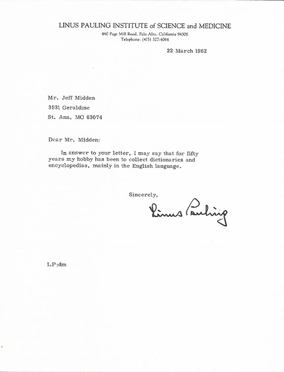 PAULING, Linus (1901-1994). American chemist, peace activist. One of the two greatest scientists of the 20th century. Recipient of the Nobel Prize in Chemistry (1954) and in Peace (1962). He is the only person to receive two unshared Nobel Prizes. Typed letter signed, one page on the letterhead of Linus Pauling Institute of Science and Medicine, 22 March 1982. Pauling responds that for fifty years my hobby has been to collect dictionaries and encyclopedias, mainly in the English language. Very boldly signed. Mailing folds otherwise in exceptionally fine condition.......................$250.00