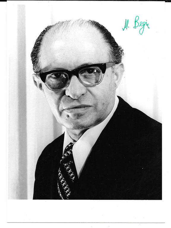 Menachem Begin, a scarce larger than usual B&W photo 5”x7” head and shoulders pose, signed in the light area, excellent contrast.