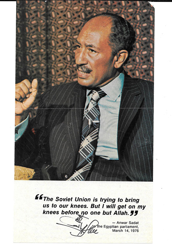 Anwar Sadat, a scarce magazine color portrait, overall size, 5”x10”, head and shoulders pose speaking regarding the Soviet Union. Boldly signed with a double signature of Sadat, once in Arabic and again in English. A fabulous trio for framing.........................$695.00
