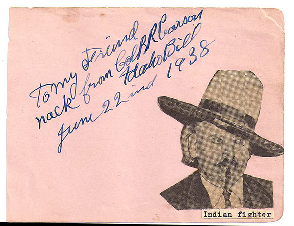 PEARSON, Colonel B.R. (1868- ? ) Indian Scout, Indian Fighter, Frontiersman, showman, big game hunter, etc. Friends with Buffalo Bill, Deadwood Dick, Pawnee Bill, Diamond Dick, Doc Carver and more. Presented to him by Buffalo Bill was a rifle used by Billy the Kid and an ivory handled revolver. He roped and loaded on a truck a 700 pound bear which he gave to President Coolidge. He appeared frequently in the movies. Vintage album page, inscribed: “To my friend nack from Col. B.R. Pearson, Idaho Bill, June 22nd 1938.” A newspaper portrait of Idaho Bill is affixed to the album page. Signatures of this famous Indian fighter and scout are quite uncommon.............. $235.00