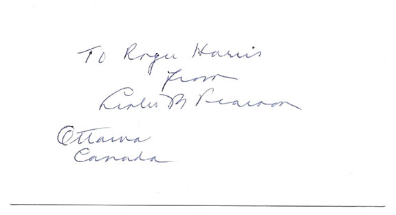 PEARSON, Lester B. (1897-1972). Canadian Prime Minister, recipient of the 1957 Nobel Peace Prize for organizing The United Nations Emergency Forces to resolve the Suez Canal Crisis. Attractive 3.25”x5.5” card inscribed and signed as follows: “To Roger Harris from Lester B. Pearson Ottawa Canada.” A genuinely nice example.......$95.00