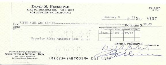 PECKINPAH, David S. (1925-1984). American film director and screen writer. His 1969 film The Wild Bunch received two Academy Award nominations. He was given the name “Bloody Sam” because of the violence in is films. Rare personal check, 8”x3”filled in in type, dated January 8, 1963, payable to Security First National Bank for $59.65 for a loan. Signed with his desirable full signature David S. Peckinpah and countersigned by Robert Schiller his business manager of Guild Management Corp. In almost 60 years this is the first item signed by David Peckinpah we have handled. Signatures free of cancellation holes. In very fine condition ..................................$350.00