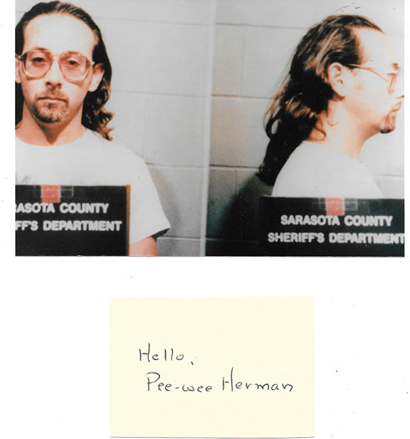 Pee-wee Herman (1952- ) Real name is Paul Ruebens an American actor, writer, film producer, game show host and comedian. He became an instant cult figure and earned a star on the Hollywood Walk of Fame (1989). He was arrested in Sarasota, Florida in 1991. He was caught masturbating during a film at an adult movie theater. In 2002 he was charged with possession of obscene material. On a manila card he has signed his name adding “Hello” in his hand. Together with a 4”x” color photograph of his mug shot taken after his arrest in the movie theater. The two.......... $25.00