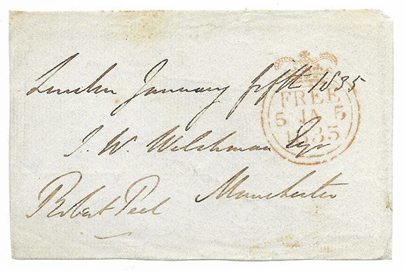 PEEL, Sir Robert (1788-1850). British Statesman and Prime Minister (1834-35) and (1841-1846). He is regarded as The Father of Modern British Policing. He is one of the Founders of the modern Conservative Party. During 1843 he was the target of a failed assassination attempt but his personal secretary was killed by the insane person. This led to the formation of the criminal defense of insanity law. Front of an envelope, London, January 5, 1835 free franking signature “Robert Peel” as Prime Minister. Rubber stamp cancellation: “Free 5 JA 5 1835.” In fine condition............$75.00