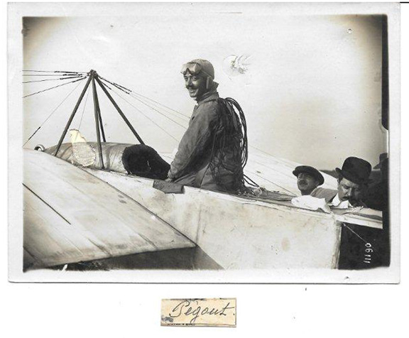 PEGOUD, Adolph (1889-1915). French aviator, early barnstormer. Known for his aerobatic feats. Some credit him with being the first aviator to “looping the loop” in an aircraft. Ace credited with six victories. Pegoud was killed in aerial combat at the age of 26 by one of his students while intercepting a German reconnaissance aircraft during the Great War. Wonderful signature “Pegoud” on a slip. Together with a photo of him standing up in his aircraft. Some defects to this photo, the major of which can be trimmed or matted out. The two.................................... $595.00