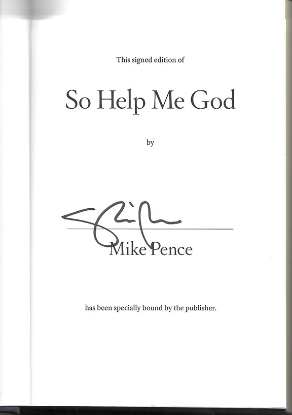 PENCE, Mike (1959- ) Forty-eight Vice-President of the U.S. (2017-2021) under President Donald J. Trump. 50th Governor of Indiana. So Help Me God. Simon & Schuster 2022 Special First Signed Edition specially bound by the publisher. Five hundred forty-two pages with illustrations. Signed on the signed edition page. In V/F condition with dust jacket...........$65.00 |