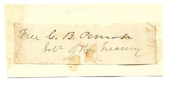 PENROSE, Clement Biddle (1798-1857). Served as Speaker of the House (2=1833-1841). Solicitor of the Treasury (1841-1845) Free franking signature, adding “Sol of the Treasury” in his hand. Affixed to a larger slip, slight light foxing...........$20.00![]() |