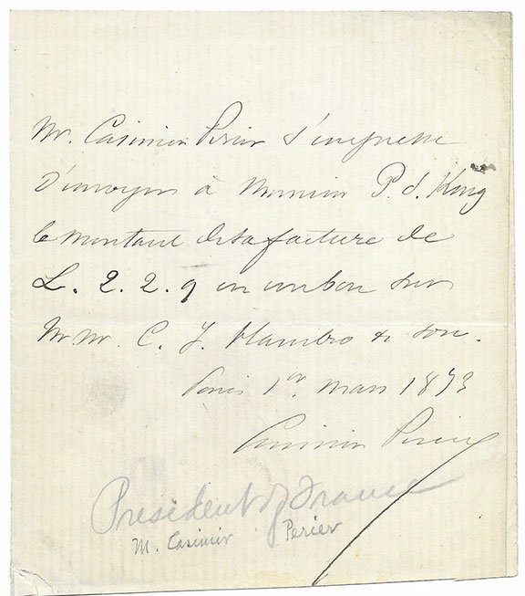 PERIER, Casimir (1847-1907). Served briefly as Premier, and the Fifth President of the Third Republic of France. He formed his own government, but it fell in six months due to his inability to cope with anarchist terrorism. Autograph letter signed, twice, once in the beginning and again at the conclusion. One page, 1 March 1873, in French, not translated. V/G.......................$95.00![]() |