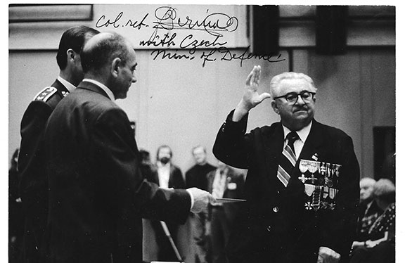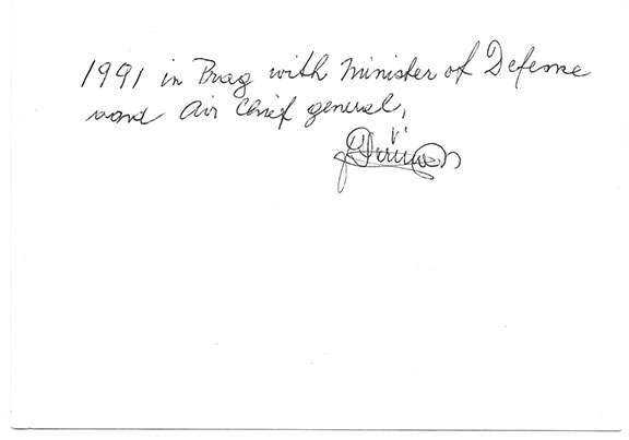 PERINA, Frantisek (1911-2006) First Czech WWII Ace. Considered the best pilot and marks man in the Czech Air Force. Later flew with France and England. Founder of the 312 Czechoslovak Fighter Squadron. Credited with 11 victories in the Battle of France and a total of 14 victories. Very scarce photograph, B&W,5”x7” of Perina wearing his medals and being handed an award by the Minister of Defense and the Air Chief General.in 1991. Signed; “Col/ ret. F.Perina with Czech Min. of Defense.’ On the verso Perina has written: “1991 in Prag with Minister of Defense and Air Chief General. F. Perina.” This was a special gift, written and signed in person in his apartment in Prague......................$165.00
