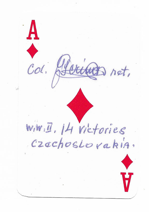 PERINA, Frantisek (1911-2006) First Czech WWII Ace. Considered the best pilot and marks man in the Czech Air Force. Later flew with France and England. Founder of the 312 Czechoslovak Fighter Squadron. Credited with 11 victories in the Battle of France and a total of 14 victories. Ace of Diamonds playing card where Perina has signed his name adding “WWII, 14 Victories Czechoslovakia.” This card was signed “in person” at his apartment in Prague, V.F condition, uncommon autograph......................$95.00