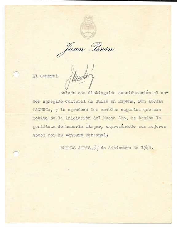 PERON, Juan (1895-1974). Argentine dictator who was president three times, June 1946 to September 1955 when he was overthrown. The last and third time from October 1973 until July 1974 (his death). Typed document signed, as president. With an embossed seal and his name imprinted stationery. Not translated but an acknowledgement to Don Lucila Machuga. Buenos Aires, 31 December 1948. Boldly signed by Juan Peron as President. Two file hole in the left margin otherwise fine...............................$275.00