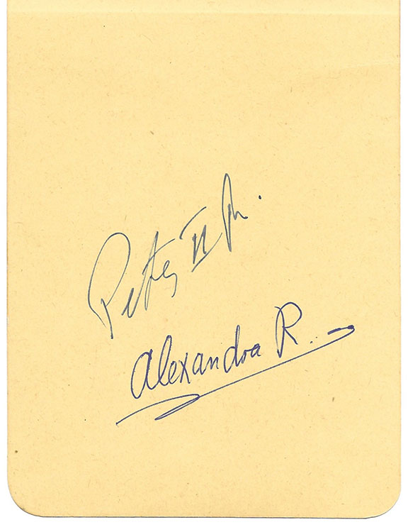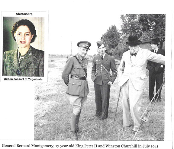 ALEXANDRA OF YUGOSLAVIA (1921-1993) Last Queen of Yugoslavia. Married in 1944 in a fairy tale romance. She made several attempts at suicide. Scarce signatures of both as King and Queen on a vintage album page. Together with a 8”x10” photo of 17-year-old King Peter II with Winston Churchill and General Bernard Montgomery taken in 1941. In addition, included is a small color photograph of the Queen. The three items would make a wonderful framed ensemble..................................$150.00