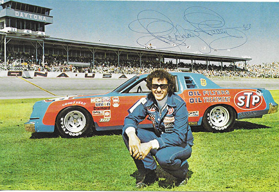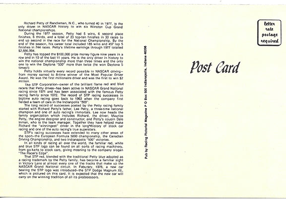 PETTY , Richard  (1937-   ) American former stock car racing driver active from (1958-1992). He holds virtually every record possible in NASCAR driving. Nicknamed “The King”.  Large vintage color postcard 5.5”x8.5” of Petty standing in front of his STP Dodge Magnum XE. Signed in the sky: “Richard Petty 43.” In V/G-Fine condition. Lengthy biography of Petty printed on the verso.......