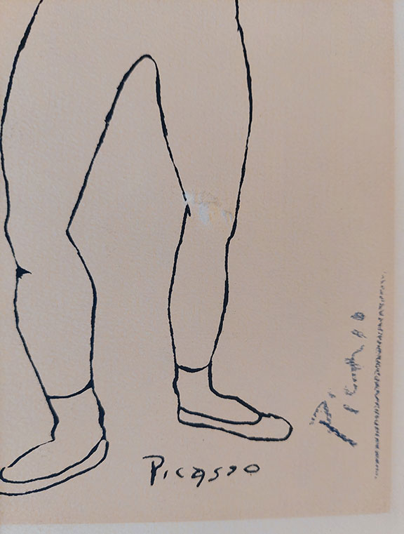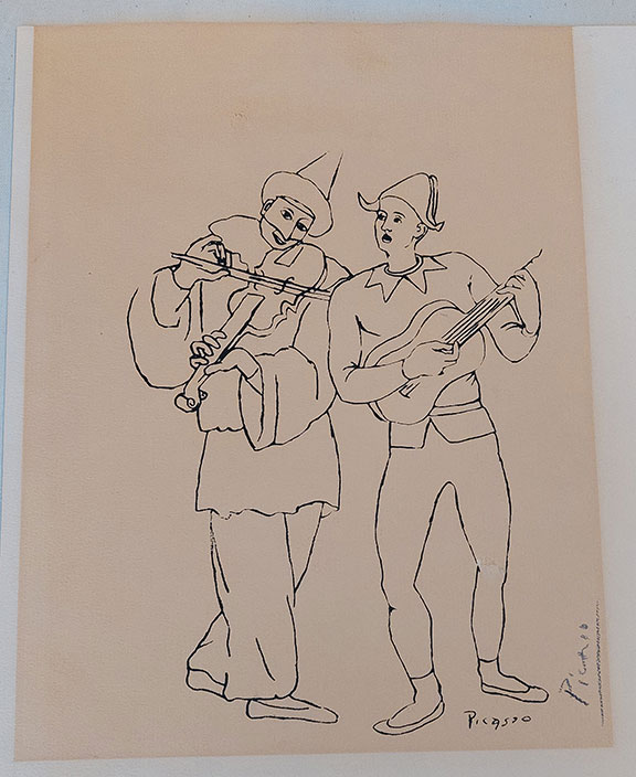 PICASSO, Pablo (1881-1973) Spanish painter, sculptor. His print “Pierrot and Harlequin” originally was made in 1918. This vintage print measures appx. 12x15.5” on heavy artist paper/card stock, image measures 10”x13” signed in the print “Picasso.” Hand signed by Picasso using a blue artist pencil near the bottom right corner. Notation on verso states this was hand signed in December 1970. Some traces from prior matting and two minor nicks, one in the clear area at top not near the portrait and the other on the left knee of an image, otherwise in fine condition and ready once again to be matted and framed.................$1200.00