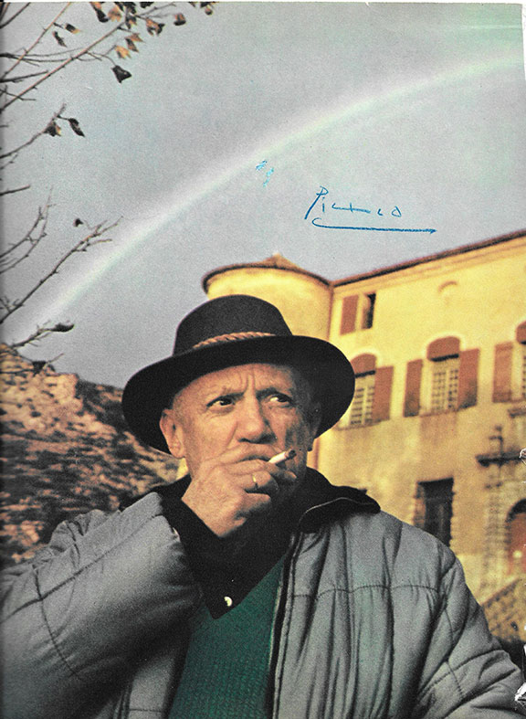 PICASSO, Pablo (1881-1973). Spanish painter, sculptor and printmaker. One of the greatest and most influential artists of the 20th Century. He co-founded the Cubist Movement. Color portrait, removed from a book, half length pose smoking a cigarette. Measures appx. 10”x12”. This is one of a very few oversized items Picasso signed through the mail in April 1970. Signed using a blue artist pencil. Very good condition. Would look fabulous framed..........................$1,250.00
