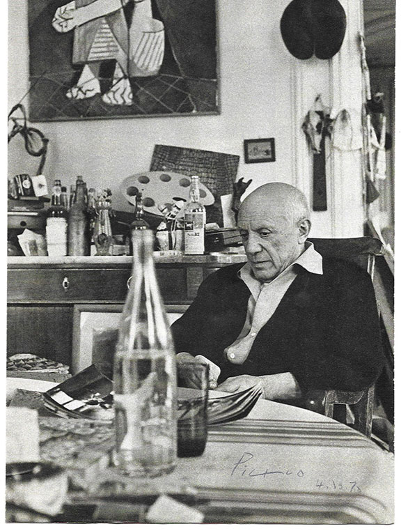 PICASSO, Pablo (1881-1973). Spanish painter, sculptor and print maker. One of the greatest and most influential artists of the 20th Century. He co-founded the Cubist Movement. Black & white portrait of the artist in his studio surrounded by liquor. Measures appx. 7.5”x10”. For years Picasso refused to sign autographs through the mail. Most collectors gave up on him. However few realized he started signing once again through the mail. This is one of the few items Picasso signed through the mail in April 1970 and through the next year. Signed and dated “4.10.70” using a blue artist pencil. Through the years signed portraits of Picasso are considered quite scarce compared to signed copies of his works. In excellent condition and would look fabulous in your favorite frame..................$895.00
