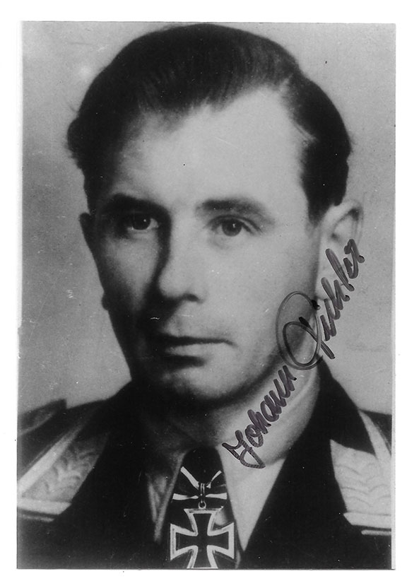 PICHLER. Johann (1912-1995). German fighter pilot during WWII. Flew with the JG-77. Ace credited with 75 victories. Awarded the Knight’s Cross of the Iron Cross. Photograph, B&W, 3”x5”, head & shoulders pose in uniform. Boldly signed, in full, with excellent contrast................ $77.50 |