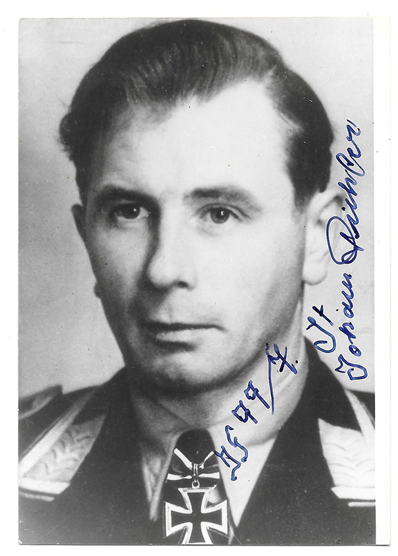 PICHLER, Johann (1912-1995). German fighter pilot during WWII. Flew with the JG-77. Ace credited with 75 victories. Awarded the Knight’s Cross of the Iron Cross. Photograph, 3.5”x5”, B&W, head & shoulders pose in uniform. Boldly signed in full and dating the signature. Excellent contrast and in very fine condition............... $85.00 |