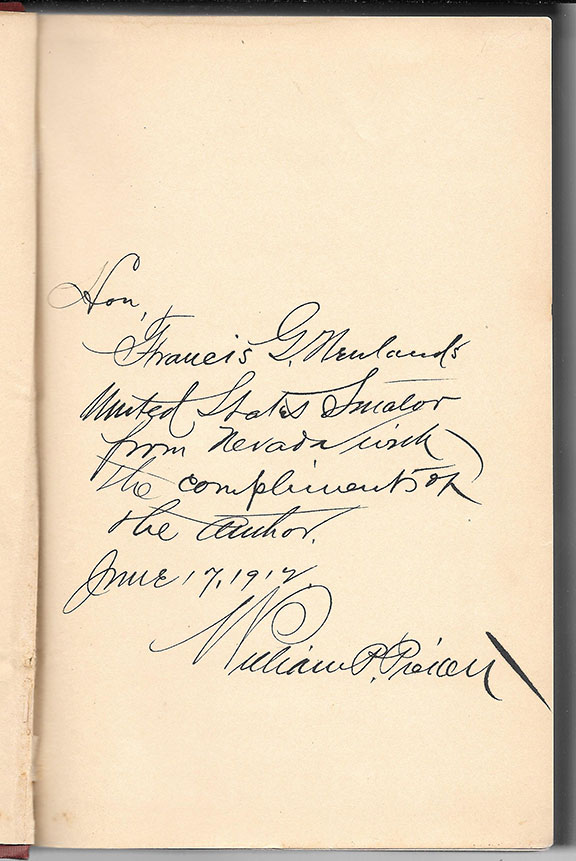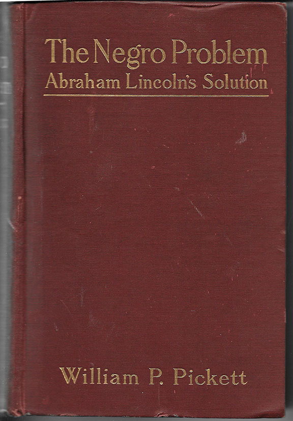 PICKETT, William P. American author. His book: “The Negro Problem-Abraham Lincoln’s Solution.” G.P. Putnam’s, The Knickerbocker Press, 1909, First Edition. Five hundred-eighty pages. Choice frontispiece portrait of Abraham Lincoln. Lengthy presentation inscription on the third blank leaf: “Hon. Francis G. Newlands, United States Senator from Nevada with the compliments of the author. June 17, 1912. William P. Pickett.” Senator Newlands was a white supremacist and supporter of western expansion. He founded the neighborhoods of Chevy Chase Washington, D.C. and Chevy Chase, MD. In very good to near fine condition, binding nice and tight...............$395.00