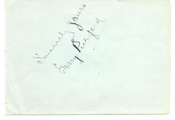 PICKFORD, Mary (1893-1979). Actress who began working at the Biograph Studios in 1909. She was the first superstar of the movies. In 1919 along with Charlie Chaplin, D.W. Griffith and Douglas Fairbanks formed United Artists. A wonderful ink signature adding “Sincerely yours” on a vintage album page..................$65.00![]() |