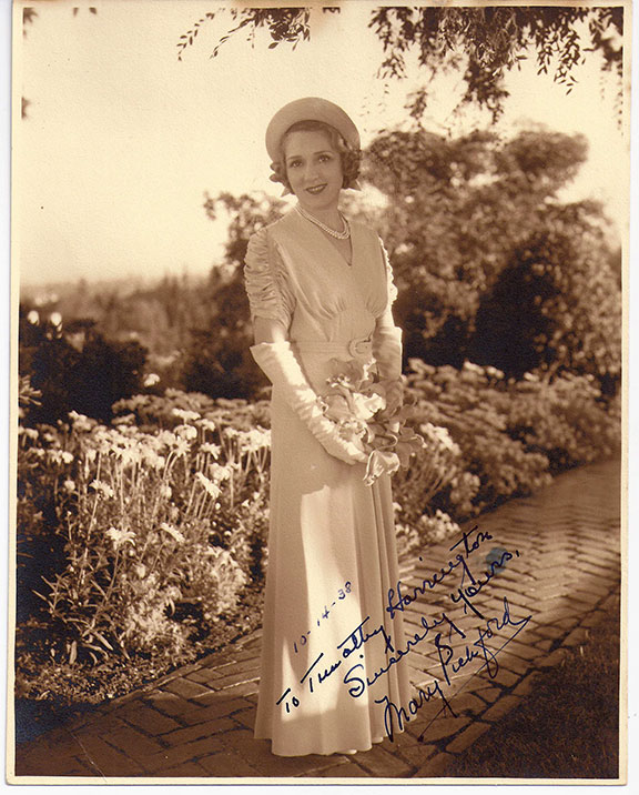 PICKFORD, Mary (1893-1979). Canadian born actress, greatest female star of the Silent Screen. Won Academy Award in 1928-29 for Best Actress in Coquette. United Artists was formed in 1919 by Pickford, Chaplin, Griffith and Fairbanks. Wonderful, vintage photograph 7.5”x9.5”, full length pose, dressed in a beautiful gown standing on a herringbone walkway in a garden. Inscribed signed and dated: “ 10-14-38, To Timothy Harrington, Sincerely yours, Mary Pickford”. Very slight smudge to the “rs” in yours otherwise an excellent example............... $450.00