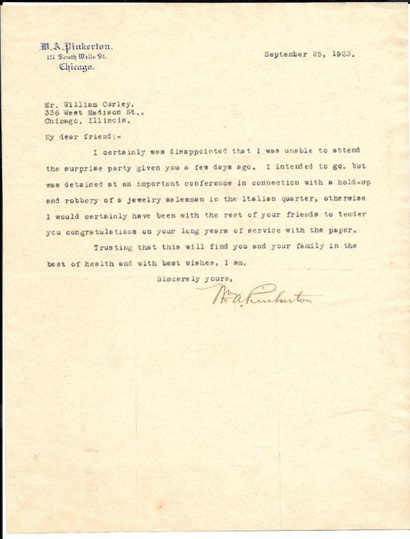 PINKERTON, William A. (1846-1923). American detective. One of the principals of the famous detective agency. He entered the Secret Service Division of the U. S. Army (1861) and served in the Civil War chiefly in the Army of the Potomac. He tracked some of the most colorful criminals of the Victorian era. Head of the Western Division of Pinkerton’s detective Agency. Very scarce typed letter signed, to William Curley on West Madison Street in Chicago, Sept. 25, 1923 on his personal letterhead just two months before his death. In part: “..I was unable to attend your surprise party....I intended to go but was detained at an important conference in connection with a hold-up and robbery of a jewelry salesman in the Italian quarter, otherwise I would certainly have been with the rest of your friends to tender you congratulations on your long years of service with the paper...” Signed “Wm. A. Pinkerton”. A fine example....................SOLD