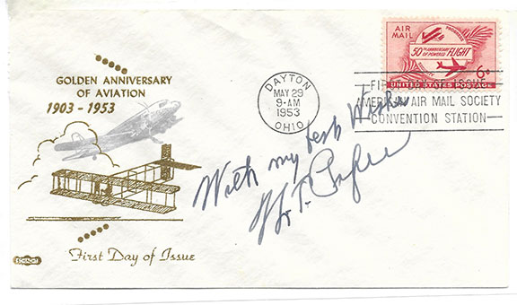 PIPER. William T. (1881-1970). American airplane manufacturer. Founder of Piper Aircraft. During WWII, he delivered over 5,600 Piper Cubs to the U.S. Government. The Piper Cubs easily eluded enemy aircraft. The aircraft is a two-seater plane that became popular as a family aircraft. First Day cover affixed with the U.S. 6 cent Air Mail stamp cancelled Dayton, Ohio, May 29,1953. Nice cachet Golden Anniversary of Aviation. Boldly signed with an uncommon four-word sentiment: “With my best wishes W.T. Piper.” Many aviation autograph collections are minus a genuine signature of Piper. Beware of Piper forgeries. Fine condition.......................$465.00